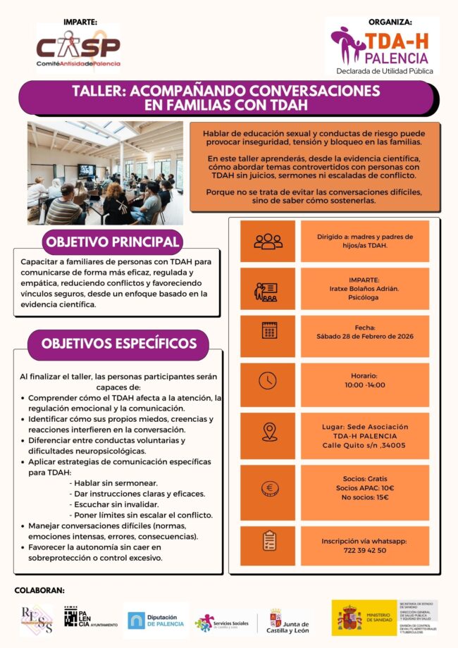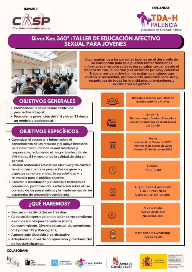 Taller de educación afectivo-sexual dirigido a jóvenes con TDAH de entre 13 y 17 años, que se desarrollará en tres sesiones los viernes 6, 13 y 27 de marzo de 2026, de 17:00 a 19:00h. Impartido por Bárbara López Gordón (educadora social y promotora de salud sexual del CCASP) y organizado por TDA-H Palencia, el…