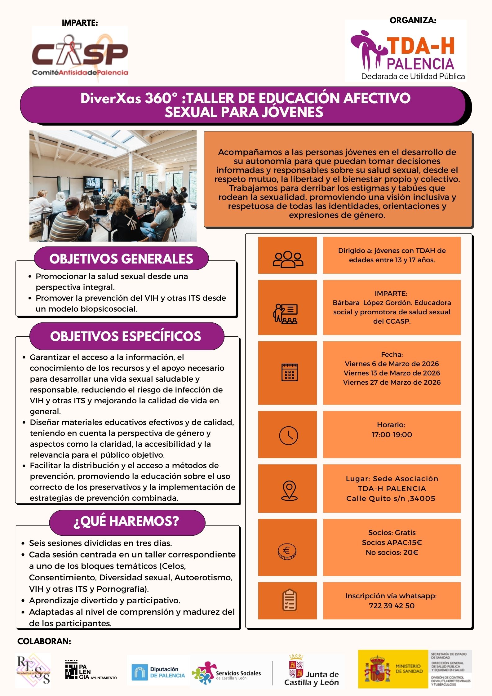 Taller de educación afectivo-sexual dirigido a jóvenes con TDAH de entre 13 y 17 años, que se desarrollará en tres sesiones los viernes 6, 13 y 27 de marzo de 2026, de 17:00 a 19:00h. Impartido por Bárbara López Gordón (educadora social y promotora de salud sexual del CCASP) y organizado por TDA-H Palencia, el taller acompaña a los jóvenes en el desarrollo de su autonomía para tomar decisiones informadas y responsables sobre su salud sexual, desde el respeto mutuo y el bienestar. Un espacio inclusivo para derribar estigmas y tabúes, promoviendo una visión respetuosa de todas las identidades, orientaciones y expresiones de género.